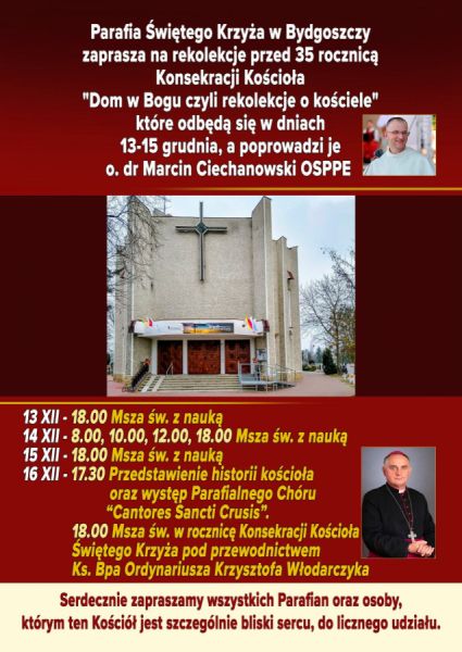 Zwieńczeniem rekolekcji będzie dzień 16 grudnia tj. wtorek kiedy to Przeżywać będziemy Rocznicę 35 - lecia Konsekracji naszego Kościoła Świętego Krzyża. Poniżej prezentujemy szczegółowy plan tej Uroczystości