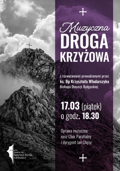 W najbliższy piątek, 17.03, zapraszamy na niezwykłą Muzyczną Drogę Krzyżową, przygotowaną przez nasz Parafialny Chór. Natomiast rozważania poprowadzi osobiście ks. Biskup Krzysztof Włodarczyk, biskup bydgoski. Nabożeństwo rozpocznie się o godz. 18.30.